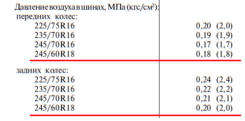Также некоторые автолюбители монтируют шины увеличенного размера для лучшей проходимости. Наибольшие колеса, устанавливаемые без серьезной переделки подвески, 265/75 Р16 следует накачивать до 1,8-2,0 кг для передней и задней оси соответственно. В пикапах допускается раздувать нагруженную ось на 2,4 Ат.
