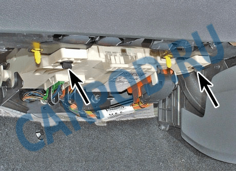 Затем провернув крепёжные клипсы на 90 градусов, опустить блок и тем самым получить доступ к предохранителям.
