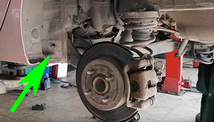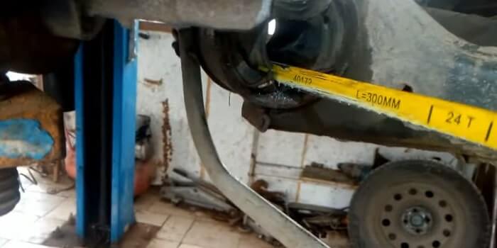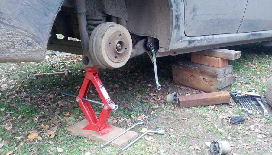 Работа выполняется поочередно: сначала на левой, затем на правой стороне или наоборот. Начинается техпроцесс с откручивания гаек крепления колес. После выполняется задача надежной фиксации задней части. Подняв колесо, подставляем упоры или прочие самодельные приспособления. Повторяем аналогичные действия с другим задним колесом. Процесс вывешивания задней балки завершен. Далее следуют смежные операции на одной из сторон: