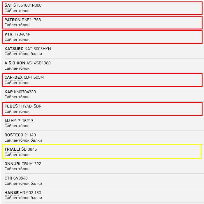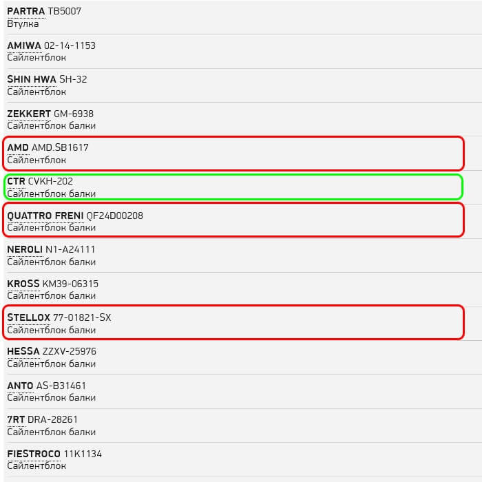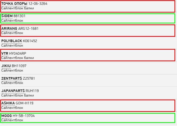 Переходим к дублям и аналогам. Зеленым цветом отмечены производители, рекомендуемые к установке. Красным отмечено низкое качество.