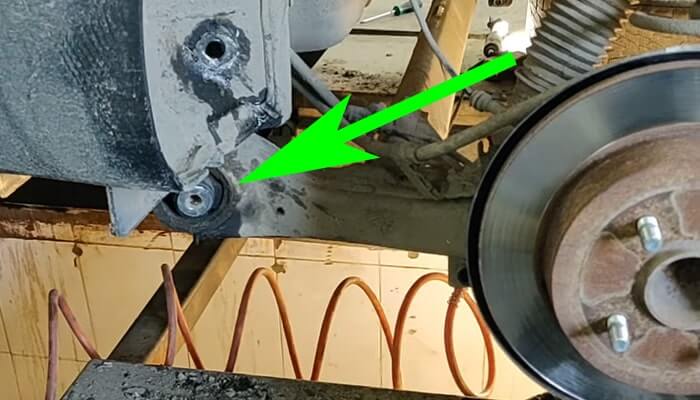 На машинах с дисковым тормозом остается только высвободить тормозную трубку из кронштейна. Согласно руководству по ремонту, эта операция выполняется путем разъединения гайки и штуцера. Последствия этого – необходимость прокачки тормозного контура. Народные эксперты нашли способ обойти совет производителя: делается пропил болгаркой в ушке и магистраль свободно отсоединяется от балки. Остается демонтировать тормозной суппорт и подвесить его в арке на проволоку.
