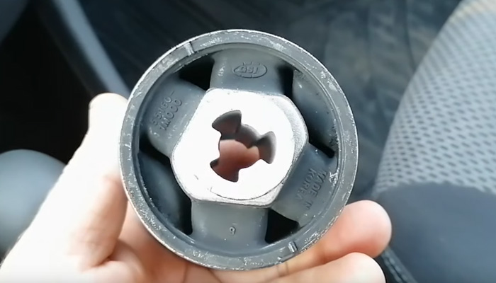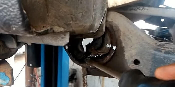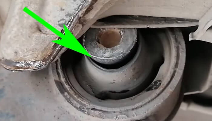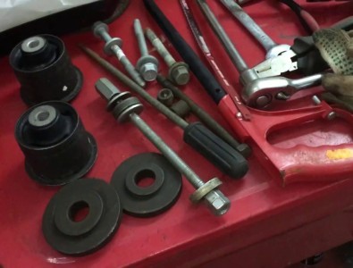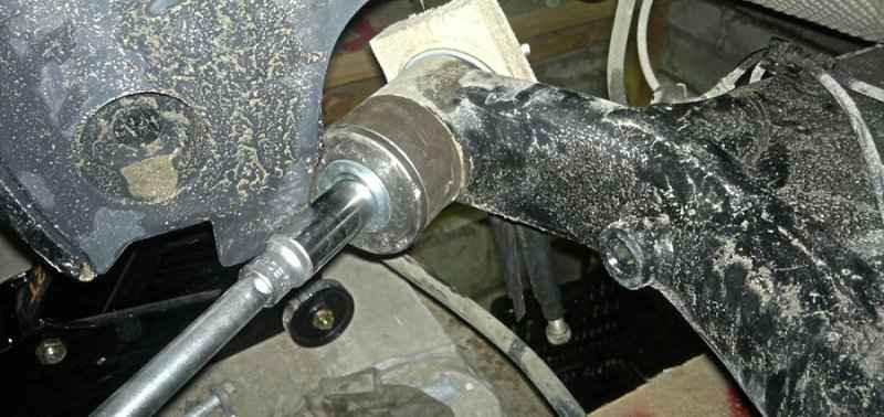 Часто является переходной стадией ввиду того, что резинометаллический шарнир слишком плотно сидит в продольном рычаге. Съемник не в состоянии его извлечь, поэтому приходится выбивать резиновую втулку из массивной части задней подвески. Непосредственно на авто этого не выполнить.