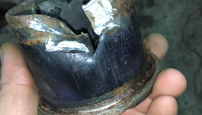 В ситуации когда порвало резину, высверливаем ее, чтобы удалить втулку и получить доступ ножовки к обойме.