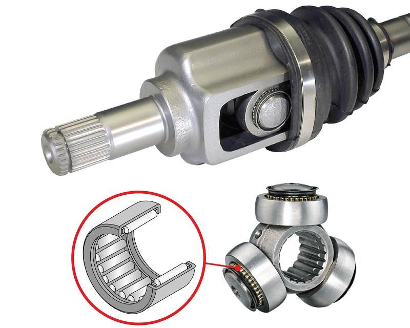 Внутри корпуса цапфы имеется шлицевая вилка с тремя лучами. В отверстия вилки запрессованы оси (лучи) для фиксации игольчатых подшипников. Внешняя обойма подшипников имеет сферическую форму, которая при повороте перемещается по канавкам корпуса. Игольчатые подшипники имеют значительную площадь контакта, что позволяет выдерживать больше усилия, чем шариковые подшипники. Также увеличивается плавность хода автомобиля и есть возможность продольного перемещения вала не только в шлицах, но и за счет качения подшипников в корпусе. Это уменьшает нагрузку на шлицевое соединение и, соответственно, его износ. Недостаток – несколько уменьшается максимальный осевой угол смещения.