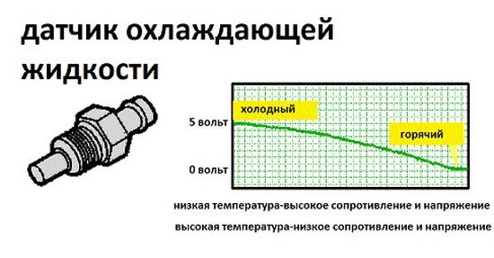 Современные датчики – это термисторы, с полупроводником, с легкостью изменяющимся сопротивлением, при колебаниях температуры. Повышение t влечет за собой увеличения количества свободных электронов в материале полупроводника, что и является причиной падения сопротивления. Т.е. обладает обратно – пропорциональной зависимостью, с отрицательным коэффициентом. Исходное сопротивление соответствует напряжению 5В. По мере нагревания двигателя, сопротивление падает до 0, и наоборот, в холодном состоянии мотора, оно максимальное. Отклонения от этого параметра фиксирует ЭБУ.